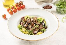 180 г • Салат с запечённой говядиной, артишоками, вялеными томатами и шпинатом в пряном соусе