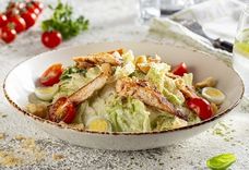 130/60/20 г • Микс из листья ромейна и айсберга, помидоры, гренки, сыр, соус цезарь, куриная грудка