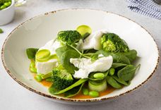 205 г • Свежий шпинат, бобы эдамаме, брокколи, кабачки, огурцы и моцарелла под соусом из маракуйи