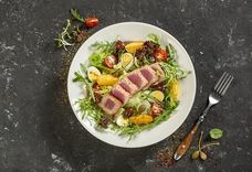 210 г • Освежающий салат с кусочками свежего тунца, дольками грейпфрута, черри, маслинамии салатным миксом под цитрусовой заправкой